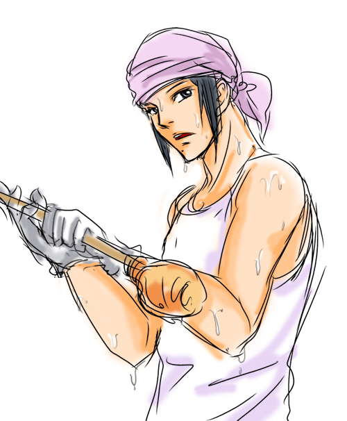 暑い工房の中ランニング姿なお松
